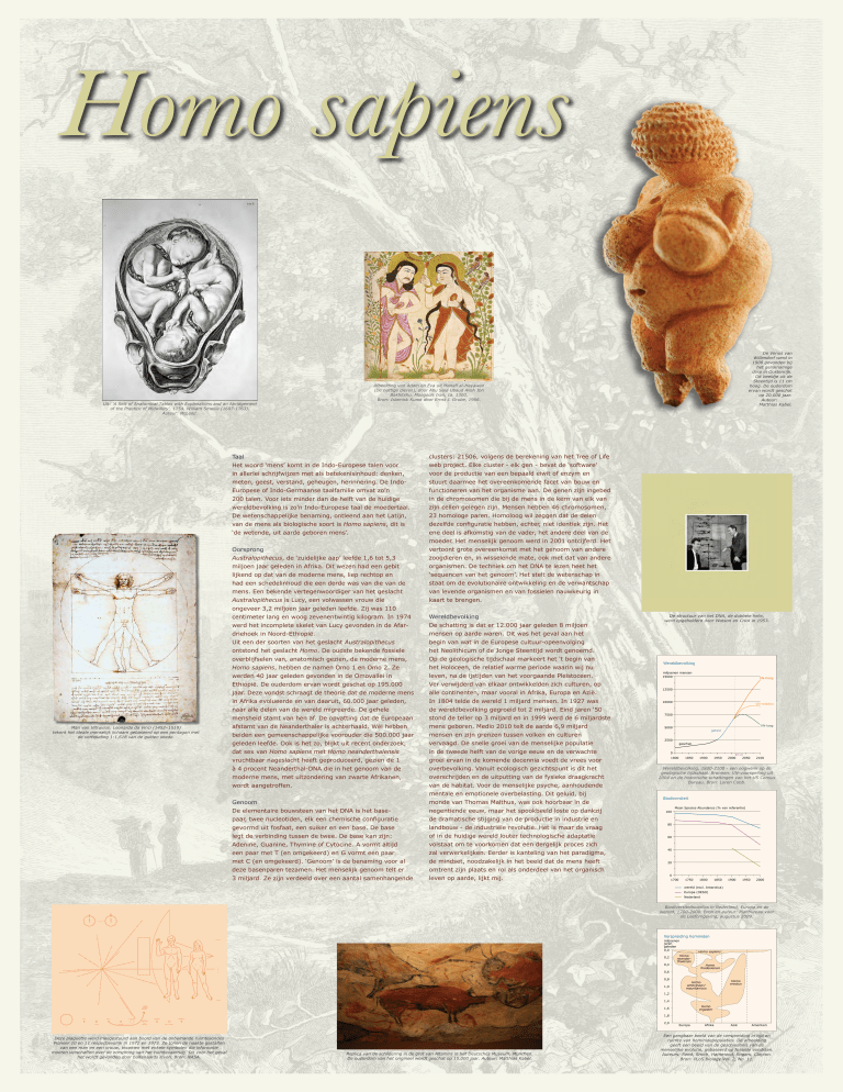 Homo sapiens De Venus van Willendorf werd in 1908 gevonden bij het gelijknamige dorp in Oostenrijk. Dit beeldje uit de Steentijd is 11 cm hoog. De ouderdom ervan wordt geschat op 20.000 jaar. Auteur: Matthias Kabel. Afbeelding van Adam en Eva uit Manafi al-Hayawan (De nuttige dieren), door Abu Said Ubaud Allah Ibn Bakhitshu. Mongools Iran, ca. 1300. Bron: Islamisk Kunst door Ernst J. Grube, 1966. Uit: 'A Sett of Anatomical Tables with Explanations and an Abridgement of the Practice of Midwifery', 1754. William Smellie (1697-1763). Auteur: McLeod. Taal clusters: 21506, volgens de berekening van het Tree of Life Het woord ‘mens’ komt in de Indo-Europese talen voor web project. Elke cluster - elk gen - bevat de ‘software’ in allerlei schrijfwijzen met als betekenisinhoud: denken, voor de productie van een bepaald eiwit of enzym en meten, geest, verstand, geheugen, herinnering. De Indo- stuurt daarmee het overeenkomende facet van bouw en Europese of Indo-Germaanse taalfamilie omvat zo’n functioneren van het organisme aan. De genen zijn ingebed 200 talen. Voor iets minder dan de helft van de huidige in de chromosomen die bij de mens in de kern van elk van wereldbevolking is zo’n Indo-Europese taal de moedertaal. zijn cellen gelegen zijn. Mensen hebben 46 chromosomen, De wetenschappelijke benaming, ontleend aan het Latijn, 23 homologe paren. Homoloog wil zeggen dat de delen van de mens als biologische soort is Homo sapiens, dit is dezelfde configuratie hebben, echter, niet identiek zijn. Het ‘de wetende, uit aarde geboren mens’. ene deel is afkomstig van de vader, het andere deel van de moeder. Het menselijk genoom werd in 2001 ontcijferd. Het Oorsprong vertoont grote overeenkomst met het genoom van andere Australopithecus, de ‘zuidelijke aap’ leefde 1,6 tot 5,3 zoogdieren en, in wisselende mate, ook met dat van andere miljoen jaar geleden in Afrika. Dit wezen had een gebit organismen. De techniek om het DNA te lezen heet het lijkend op dat van de moderne mens, liep rechtop en ‘sequencen van het genoom’. Het stelt de wetenschap in had een schedelinhoud die een derde was van die van de staat om de evolutionaire ontwikkeling en de verwantschap mens. Een bekende vertegenwoordiger van het geslacht van levende organismen en van fossielen nauwkeurig in Australopithecus is Lucy, een volwassen vrouw die kaart te brengen. ongeveer 3,2 miljoen jaar geleden leefde. Zij was 110 Man van Vitruvius: Leonardo da Vinci (1452–1519) tekent het ideale menselijk lichaam gebaseerd op een pentagon met de verhouding 1:1,618 van de gulden snede. centimeter lang en woog zevenentwintig kilogram. In 1974 Wereldbevolking werd het incomplete skelet van Lucy gevonden in de Afar- De schatting is dat er 12.000 jaar geleden 8 miljoen driehoek in Noord-Ethiopië. mensen op aarde waren. Dit was het geval aan het Uit een der soorten van het geslacht Australopithecus begin van wat in de Europese cultuur-opeenvolging ontstond het geslacht Homo. De oudste bekende fossiele het Neolithicum of de Jonge Steentijd wordt genoemd. overblijfselen van, anatomisch gezien, de moderne mens, Op de geologische tijdschaal markeert het ‘t begin van Homo sapiens, hebben de namen Omo 1 en Omo 2. Ze het Holoceen, de relatief warme periode waarin wij nu werden 40 jaar geleden gevonden in de Omovallei in leven, na de ijstijden van het voorgaande Pleistoceen. Ethiopië. De ouderdom ervan wordt geschat op 195.000 Ver verwijderd van elkaar ontwikkelden zich culturen, op jaar. Deze vondst schraagt de theorie dat de moderne mens alle continenten, maar vooral in Afrika, Europa en Azië. in Afrika evolueerde en van daaruit, 60.000 jaar geleden, In 1804 telde de wereld 1 miljard mensen. In 1927 was naar alle delen van de wereld migreerde. De gehele de wereldbevolking gegroeid tot 2 miljard. Eind jaren ‘50 mensheid stamt van hen af. De opvatting dat de Europeaan stond de teller op 3 miljard en in 1999 werd de 6 miljardste afstamt van de Neanderthaler is achterhaald. Wél hebben mens geboren. Medio 2010 telt de aarde 6,9 miljard beiden een gemeenschappelijke voorouder die 500.000 jaar mensen en zijn grenzen tussen volken en culturen geleden leefde. Ook is het zo, blijkt uit recent onderzoek, vervaagd. De snelle groei van de menselijke populatie dat sex van Homo sapiens met Homo neanderthalensis in de tweede helft van de vorige eeuw en de verwachte vruchtbaar nageslacht heeft geproduceerd, gezien de 1 groei ervan in de komende decennia voedt de vrees voor à 4 procent Neanderthal-DNA die in het genoom van de overbevolking. Vanuit ecologisch gezichtspunt is dit het moderne mens, met uitzondering van zwarte Afrikanen, overschrijden en de uitputting van de fysieke draagkracht wordt aangetroffen. van de habitat. Voor de menselijke psyche, aanhoudende mentale en emotionele overbelasting. Dit geluid, bij Genoom monde van Thomas Malthus, was ook hoorbaar in de De elementaire bouwsteen van het DNA is het base- negentiende eeuw, maar het spookbeeld loste op dankzij paar, twee nucleotiden, elk een chemische configuratie de dramatische stijging van de productie in industrie en gevormd uit fosfaat, een suiker en een base. De base landbouw - de industriële revolutie. Het is maar de vraag legt de verbinding tussen de twee. De base kan zijn: of in de huidige wereld louter technologische adaptatie Adenine, Guanine, Thymine of Cytocine. A vormt altijd volstaat om te voorkomen dat een dergelijk proces zich een paar met T (en omgekeerd) en G vormt een paar zal verwerkelijken. Eerder is kanteling van het paradigma, met C (en omgekeerd). ‘Genoom’ is de benaming voor al de mindset, noodzakelijk in het beeld dat de mens heeft deze basenparen tezamen. Het menselijk genoom telt er omtrent zijn plaats en rol als onderdeel van het organisch 3 miljard. Ze zijn verdeeld over een aantal samenhangende leven op aarde, lijkt mij. De structuur van het DNA, de dubbele helix, werd opgehelderd door Watson en Crick in 1953. Wereldbevolking miljoenen mensen 15000 VN-h