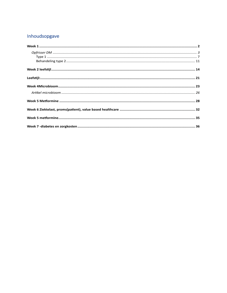 Inhoudsopgave Week 1 ............................................................................................................................................................. 2 Opfrisser DM ...................................................................................................................................................... 3 Type 1 ............................................................................................................................................................ 7 Behandeling type 2 ...................................................................................................................................... 11 Week 2 leefstijl ............................................................................................................................................... 14 Leefstijl:.......................................................................................................................................................... 21 Week 4Microbioom ........................................................................................................................................ 23 Artikel microbioom ........................................................................................................................................... 26 Week 5 Metformine ....................................................................................................................................... 28 Week 6 Ziektelast, proms(patient), value based healthcare ........................................................................... 32 Week 5 metformine........................................................................................................................................ 35 Week 7 -diabetes en zorgkosten ..................................................................................................................... 36 Week 1 Opfrisser DM Doel Je kunt kennis omtrent epidemiologie, pathofysiologie, symptomatologie, classificatie, behandeling en complicaties toepassen bij personen met diabetes mellitus. Twee grote ontwikkelingen: - Medicijnen - Glucose monitoring Def:= chronische verhoging van bloedglucosewaardes al of niet met symptomen. Glucose nuchter moet <5,6 (100mg/dl) Willekeurig glucose <7,8 (140 mg/dl) DM nuchter >7 niet nuchter >11,1 (200) - Hier tussenin =gestoorde glucosetolerantie =prediabetes. Ook bij normale mensen zie je pieken als je suikerruik eten eet. Mensen die zelf sensor kopen hebben we eigenlijk nog geen normaal waarde voor insuline waarde.op basis van sensor kan je geen DM stellen want geen afkapwaardes Symptomen. Classificatie DM - LADA is type 1 in oudere bij volwassenen monogene DM zijn eigenlijk types die overerven via een gen ADA DM classifactie GADA lijkt iets meer type 1 en onderste meer op type2 Laatste classificatie WHO take home: - Grote groep type 1 en type 2 - Type 2 niet populair (mensen zeggen dat door oorzaken komen.) - Best veel tussenvormen- veel mensen willen graag precies weten wat ze nu type hebben - Tal van zeldzamere specifieke DMvormen diabetes type anders - Gemeenschappelijk bloedsuiker verhoogd. Type 1 Insuline - Humane insuline even goed als menselijke - In nederland toediening via een pen = basaal bolus regimen (MDI) kort durende en langwerkende insuline geven voor de maaltijden kortwerkende BOLUS en na maaltijden de langwerkende (basaal) Je kan ook contineu insuline geven via een apparaatje - Nadeel apparaatje hele tijd aanjezelf 40 procent type 1 gebruikt pomp. Toediening gaat subcutaan normaal gaat dit via portale systeem. - Vertraagde absorptie - Relatieve systemische hyperinsulinemia en hepatische hypoinsulinmia - Gewichtstoename AGP raport getallen hoe glucose gemiddeld is, zat die laag, of te hoog kijken hoe iemand is ingesteld We willen van CGM naar closed loop automatische insuline infusie Behandeling type 2 = HVZ risico verlagen - Suiker managen - Bloeddruk managen - Lipiden manegen - Nierfunctie 10 kg afvallen heeft veel effect op risico 5 % gewichtsverlies gezondheidswinst 10% voorkomen DM insuline richtlijnen: - Insuline geven als met 2-3 orale middelen het behandeldoel niet wordt gehaald - Insuline is meest efficiente manier op HbA1c waarde naar doel te krijgen basale insuline eerste stap als dat niet werkt kortwerkende insuline aan de behandeling toeveogen - Nadelen zijn: injecties en leid tot gewichtstoenamen en kan sop hypoglycekiem Contineu meting met sensor Week 2 leefstijl Simpele visie= overgewicht als meer energie lichaam in komt als uit gaat.k 1kg vet =8000 kcal Bij aankomen/afvallen veranderd basale energiebehoefte =weight stimulator Als je 100 kcal meer eet en dit 5 jaar lang doet zal je niet lineair omhoog gaan je basale verbruik gaat ook omhoog. Er zal een evenwicht optreden uitelkaar. Dus grootste veranderingen is eerste jaar grootst. Waarom is niet iedereen dik? - Verschillen zijn deels genetisch bepaald - Tweelingstudies intrapair correlatie coefficient van BMI helft wordt genetisch bepaald. - Ook omgevingveranderingen. - 1% genetische variatie pas verklaard. gemiddelde overgwicht persoon valt weinig over te ontdekken. Andere hypotheses: - Tempratuur beinvloeding (kachels) - Minder slaap - Microbioom - Stress - Soicaal netwerk Psychisch en medicatie - Antidepressiva zijn dikmakers of moeilijk om af te vallen - Beta blokers - Pijn medicatie - onstekingremmers Leefstijlverbetering Overheid - verbieden, reguleren , taxen, nudging(geen kortingen meer op alchohol, alchohol vrij wel) , inform, industrie afspraken , zelf uitzoeken induvidueel - preventie akkoord (niet effectief gebleken) Helpt levenstijlinterventie Depositiocontracten - stick werkt beter dan carot medicijnen - BMI 35-40 en meegedaan aan levenstijlinterventie Als we levenstijl ten gunste kunnen veranderen vermindert dat de kosten op korte termijn. Alles wat wij medici doen is kostenverhogend. neuropathie Dikke vezels verlies gnostisch (proprioceptie) Dunne vezels vrlies vitale (