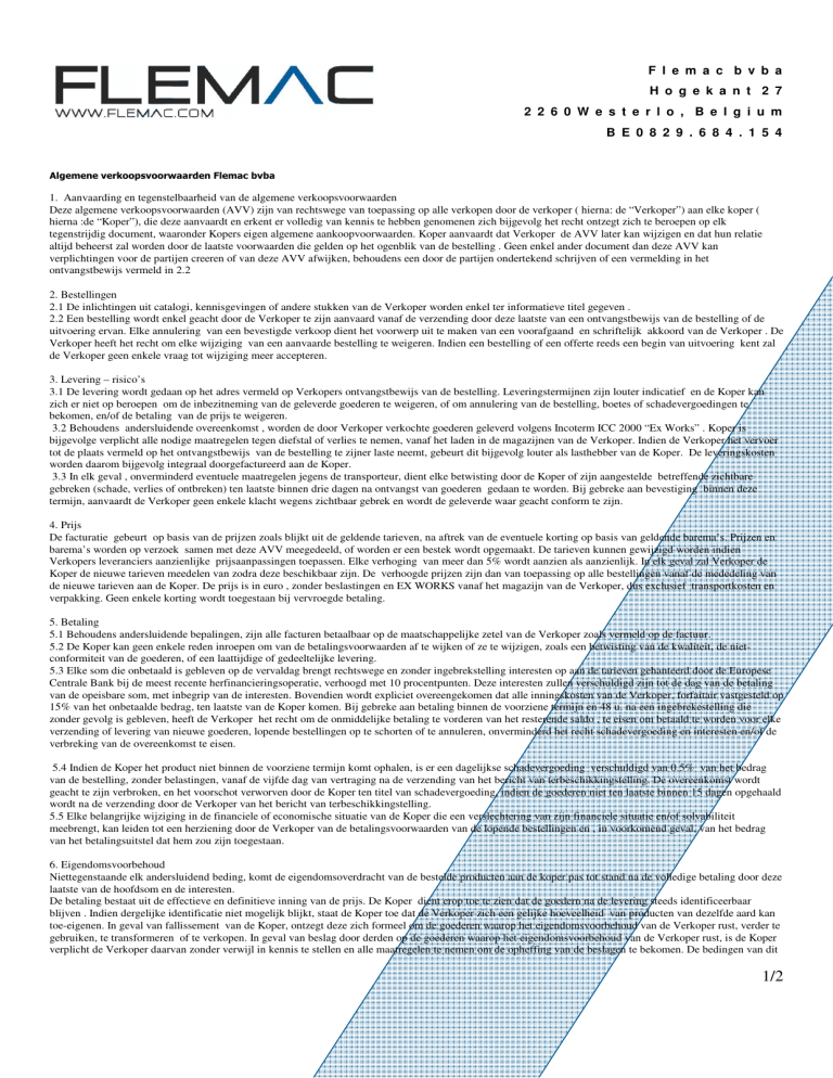 F l e m a c b v b a H o g e k a n t 2 7 2 2 6 0 W e s t e r l o , B e l g i u m B E 0 8 2 9 . 6 8 4 . 1 5 4 Algemene verkoopsvoorwaarden Flemac bvba 1. Aanvaarding en tegenstelbaarheid van de algemene verkoopsvoorwaarden Deze algemene verkoopsvoorwaarden (AVV) zijn van rechtswege van toepassing op alle verkopen door de verkoper ( hierna: de “Verkoper”) aan elke koper ( hierna :de “Koper”), die deze aanvaardt en erkent er volledig van kennis te hebben genomenen zich bijgevolg het recht ontzegt zich te beroepen op elk tegenstrijdig document, waaronder Kopers eigen algemene aankoopvoorwaarden. Koper aanvaardt dat Verkoper de AVV later kan wijzigen en dat hun relatie altijd beheerst zal worden door de laatste voorwaarden die gelden op het ogenblik van de bestelling . Geen enkel ander document dan deze AVV kan verplichtingen voor de partijen creeren of van deze AVV afwijken, behoudens een door de partijen ondertekend schrijven of een vermelding in het ontvangstbewijs vermeld in 2.2 2. Bestellingen 2.1 De inlichtingen uit catalogi, kennisgevingen of andere stukken van de Verkoper worden enkel ter informatieve titel gegeven . 2.2 Een bestelling wordt enkel geacht door de Verkoper te zijn aanvaard vanaf de verzending door deze laatste van een ontvangstbewijs van de bestelling of de uitvoering ervan. Elke annulering van een bevestigde verkoop dient het voorwerp uit te maken van een voorafgaand en schriftelijk akkoord van de Verkoper . De Verkoper heeft het recht om elke wijziging van een aanvaarde bestelling te weigeren. Indien een bestelling of een offerte reeds een begin van uitvoering kent zal de Verkoper geen enkele vraag tot wijziging meer accepteren. 3. Levering – risico’s 3.1 De levering wordt gedaan op het adres vermeld op Verkopers ontvangstbewijs van de bestelling. Leveringstermijnen zijn louter indicatief en de Koper kan zich er niet op beroepen om de inbezitneming van de geleverde goederen te weigeren, of om annulering van de bestelling, boetes of schadevergoedingen te bekomen, en/of de betaling van de prijs te weigeren. 3.2 Behoudens andersluidende overeenkomst , worden de door Verkoper verkochte goederen geleverd volgens Incoterm ICC 2000 “Ex Works” . Koper is bijgevolge verplicht alle nodige maatregelen tegen diefstal of verlies te nemen, vanaf het laden in de magazijnen van de Verkoper. Indien de Verkoper het vervoer tot de plaats vermeld op het ontvangstbewijs van de bestelling te zijner laste neemt, gebeurt dit bijgevolg louter als lasthebber van de Koper. De leveringskosten worden daarom bijgevolg integraal doorgefactureerd aan de Koper. 3.3 In elk geval , onverminderd eventuele maatregelen jegens de transporteur, dient elke betwisting door de Koper of zijn aangestelde betreffende zichtbare gebreken (schade, verlies of ontbreken) ten laatste binnen drie dagen na ontvangst van goederen gedaan te worden. Bij gebreke aan bevestiging binnen deze termijn, aanvaardt de Verkoper geen enkele klacht wegens zichtbaar gebrek en wordt de geleverde waar geacht conform te zijn. 4. Prijs De facturatie gebeurt op basis van de prijzen zoals blijkt uit de geldende tarieven, na aftrek van de eventuele korting op basis van geldende barema’s. Prijzen en barema’s worden op verzoek samen met deze AVV meegedeeld, of worden er een bestek wordt opgemaakt. De tarieven kunnen gewijzigd worden indien Verkopers leveranciers aanzienlijke prijsaanpassingen toepassen. Elke verhoging van meer dan 5% wordt aanzien als aanzienlijk. In elk geval zal Verkoper de Koper de nieuwe tarieven meedelen van zodra deze beschikbaar zijn. De verhoogde prijzen zijn dan van toepassing op alle bestellingen vanaf de mededeling van de nieuwe tarieven aan de Koper. De prijs is in euro , zonder beslastingen en EX WORKS vanaf het magazijn van de Verkoper, dus exclusief transportkosten en verpakking. Geen enkele korting wordt toegestaan bij vervroegde betaling. 5. Betaling 5.1 Behoudens andersluidende bepalingen, zijn alle facturen betaalbaar op de maatschappelijke zetel van de Verkoper zoals vermeld op de factuur. 5.2 De Koper kan geen enkele reden inroepen om van de betalingsvoorwaarden af te wijken of ze te wijzigen, zoals een betwisting van de kwaliteit, de nietconformiteit van de goederen, of een laattijdige of gedeeltelijke levering. 5.3 Elke som die onbetaald is gebleven op de vervaldag brengt rechtswege en zonder ingebrekstelling interesten op aan de tarieven gehanteerd door de Europese Centrale Bank bij de meest recente herfinancieringsoperatie, verhoogd met 10 procentpunten. Deze interesten zullen verschuldigd zijn tot de dag van de betaling van de opeisbare som, met inbegrip van de interesten. Bovendien wordt expliciet overeengekomen dat alle inningskosten van de Verkoper, forfaitair vastgesteld op 15% van het onbetaalde bedrag, ten laatste van de Koper komen. Bij gebreke aan betaling binnen de voorziene termijn en 48 u. na een ingebrekestelling die zonder gevolg is gebleven, heeft de Verkoper het recht om de onmiddelijke betaling te vorderen van het resterende saldo , te eisen om betaald te worden voor elke verzending of levering van nieuwe goederen, lopende bestellingen op te schorten of te annuleren, onverminderd het recht schadevergoeding en interesten en/of de verbreking van de overeenkomst te eisen. 5.4 Indien de Koper het product niet binnen de voorziene termijn komt ophalen, is er een dagelijkse schadevergoeding verschuldigd van 0.5% van het bedrag van de bestelling, zonder belastingen, vanaf de vijfde dag van vertraging na de verzending van het bericht van terbeschikkingstelling. De overeenkomst wordt geacht te zijn verbroken, en het voorschot verworven door de Koper ten titel van schadevergoeding, indien de goederen niet ten laatste binnen 15 dagen opgehaald wordt na de verzending door de Verkoper van het bericht van terbeschikkingstelling. 5.5 Elke belangrijke wijziging in de financiele of economische situatie van de Koper die een verslechtering van zijn financiele situatie en/of solvabiliteit